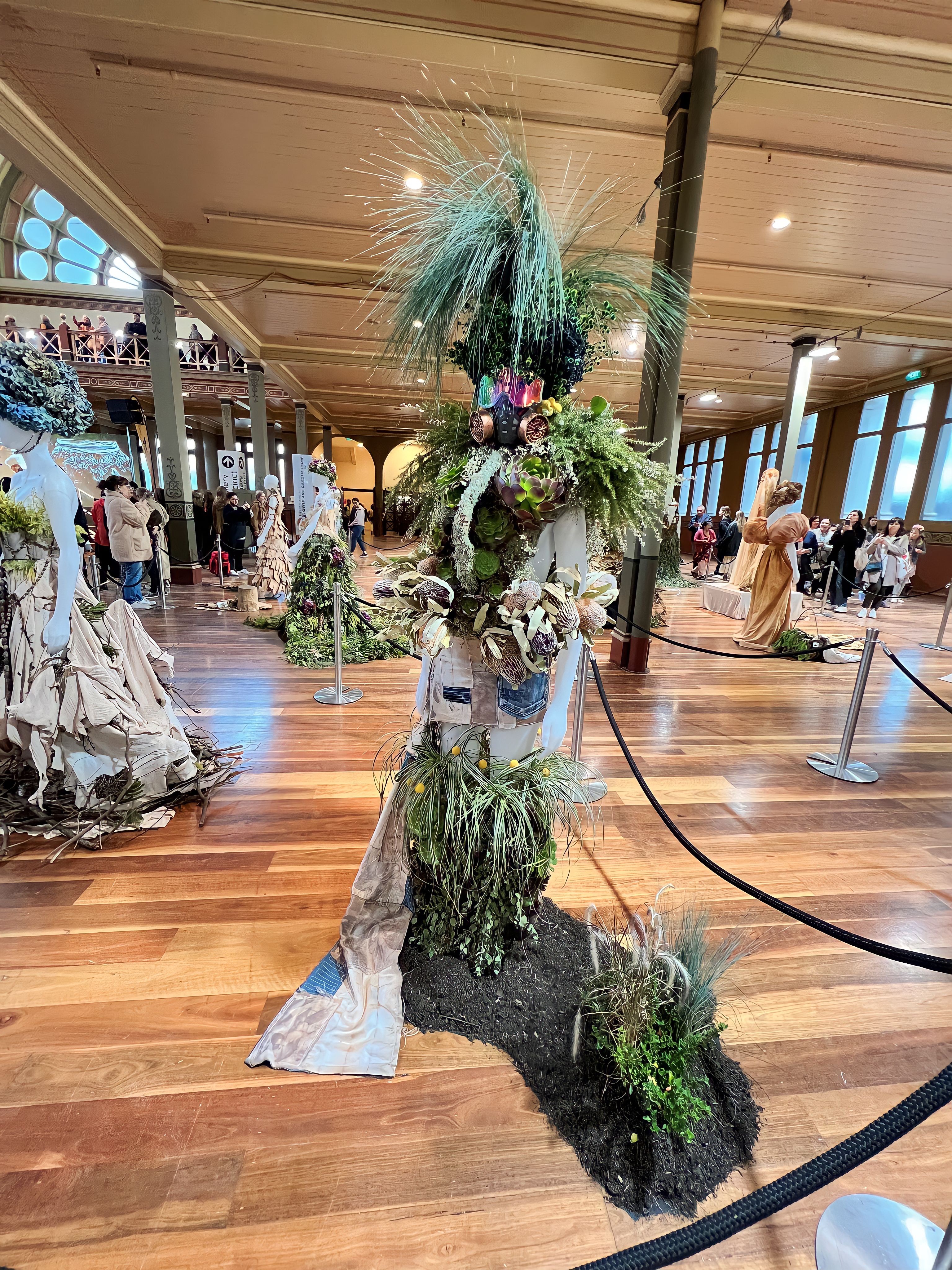 The headpiece, breastplate and boots were all made from both local native species and plants foraged in suburban gardens and parks in Melbourne which meant they do not need to be imported or transported from vast distances reinforcing our intention to minimise the environmental impact of the project. Aeonium succulents and hardy species such as Lomandra, wax flower plants and ecalyptus leaves ensured longevity past the duration of the exhibition.